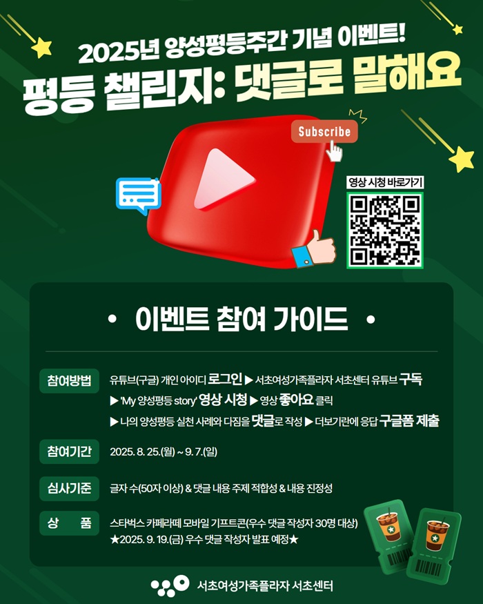 서초센터 유튜브에서 [My 양성평등 Stoy] 시청 후 여러분의 양성평등 실천 사례와 다짐을 댓글로 남겨주세요! 우수 댓글 작성자 30분께 스타벅스 카페라떼 모바일 쿠폰을 드립니다! ★참여방법 1. 유튜브 개인 아이디 로그인 후 서초센터 유튜브 구독 클릭! 2. 서초여성가족플라자 서초센터 유튜브 채널에 게시된 [My 양성평등 Stoy] 영상 시청 3. 영상에 좋아요 클릭 후 본인의 양성평등 실천 사례와 다짐 댓글로 작성 4. 영상 아래 더보기란에 작성된 구글폼 링크 클릭하여 개인 정보 제출 ★참여기간: 2025. 8. 25.(월)~9. 7.(일) ★우수 댓글 작성자 발표: 2025. 9. 19.(금) 예정 ★우수 댓글 심사 기준 - 글자 수 50자 이상 *필수 - 댓글 내용 주제(본인의 양성평등 실천 사례와 다짐) 적합성 - 내용의 진정성(예: 양성평등 가치관에 대한 진실성과 공감성) ★유의사항 - 연락처 기준, 중복 참여 불가 - 참여자가 작성한 응답(개인 연락처 등) 오류로 당첨 상품 전송이 불가할 경우 당첨 취소 처리 - 당첨 상품 품절 시 동일 가격대 유사 상품으로 제공 예정 - 작성해주신 응답은 서초여성가족플라자 서초센터 홍보 자료로 활용됩니다. 많은 관심과 참여 바랍니다:) |