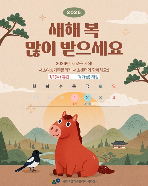 2025년 한 해 동안서초여성가족플라자 서초센터와 함께해 주신 모든 분들께깊은 감사의 말씀을 드립니다. 다가오는 2026년에도새로운 시작과 의미 있는 여정에서초센터가 함께할 수 있기를 바랍니다. 앞으로도 변함없는 관심과 성원 부탁드리며,새해 복 많이 받으시기 바랍니다. -서초여성가족플라자 서초센터 일동-
