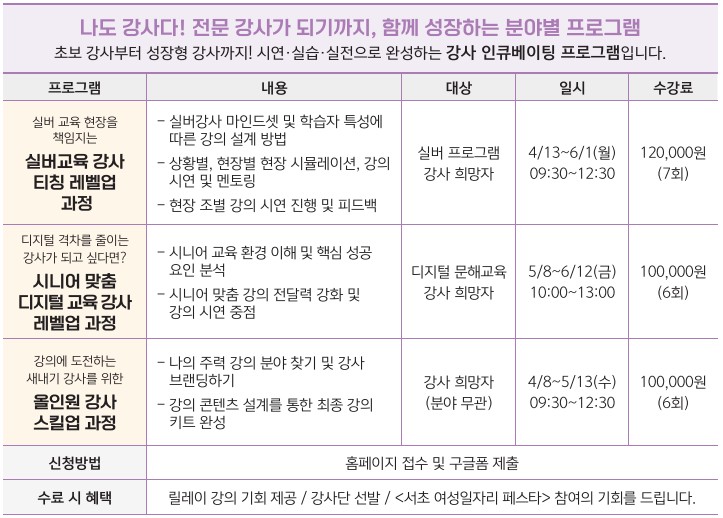 ○교육 수료 후 활동 연계: 릴레이 강의 기회 제공 / 강사단 선발 / 26년 7월 「서초 여성일자리 페스타」참여 기회 제공